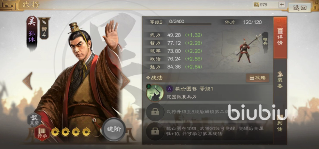 孙休这个角色在游戏当中从属性值来看最高的是魅力,除魅力以外其他的数值也是能够达到非常平均的样子。正因如此得到孙休的很多玩家都表示想用却不会用,其实玩家在角色上如果下了非常多的功夫,应该也不会被难住。