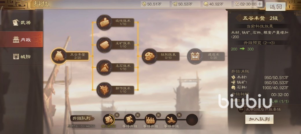 最后就是天赋科技的解锁,也会提升铁矿的产量,第一个天赋五谷丰登必须点满,然后缺什么资源就点下一个分支天赋,缺矿就优先点采矿技术。