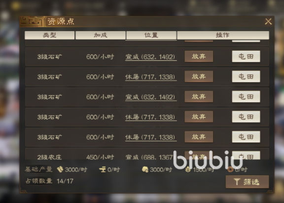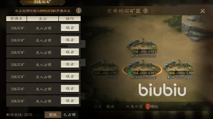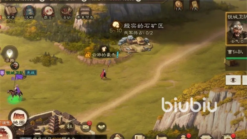 然后就是游戏里的占据点玩法了,玩家能派出自己的武将队伍出门去占领各种资源点,具体就是打败据点的AI敌人,成功后就可以在一定时间内获得资源的收取权,可显著提升当前的对应资料产量。