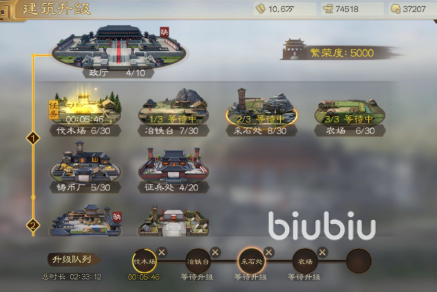 石料的采集速度取决于采石场的自身等级,而采石场的升级,需要消耗木材,铁矿等资源,这些可以就靠另外两个资源设施来获取了。等级高的时候,每小时给的石料也会变得更多。