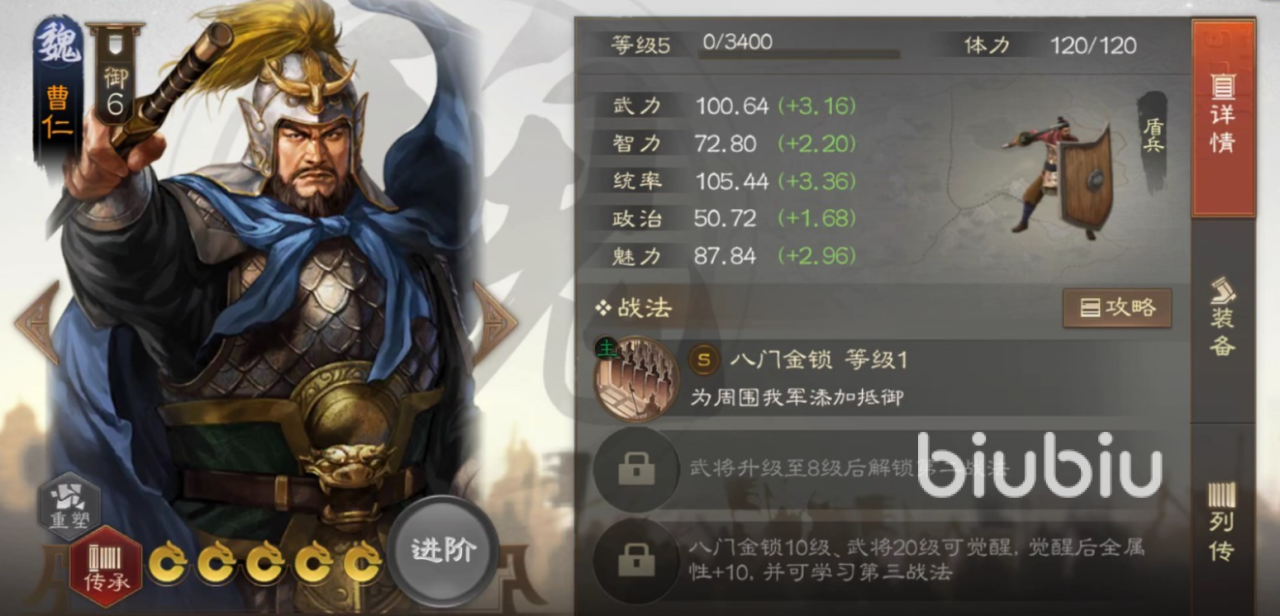 第二天就是名将曹仁了,该角色的强度在前期绝对是人手一个的存在,作为坦克可以成为带领整个队伍的核心角色,有这个角色的萌新前期基本上是没有任何害怕的敌人的,快速占领周围的资源的时候让他带队绝对没错。