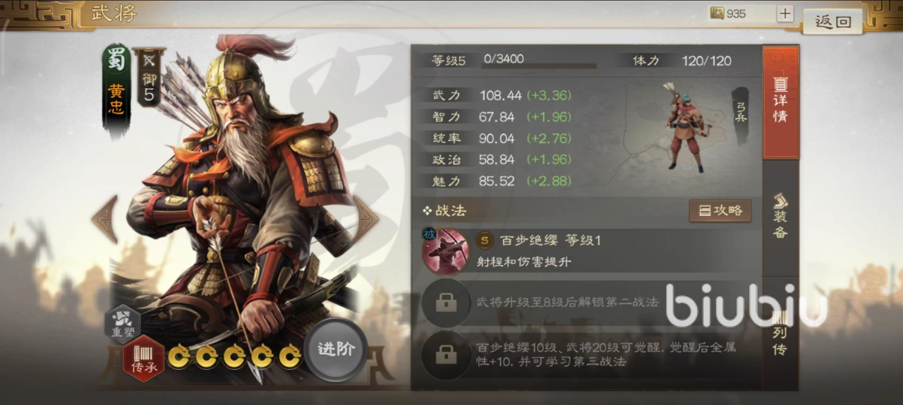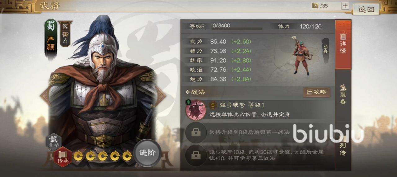 严颜这名老将虽然自身武力值并不高,好在技能效果出色,除了造成单体伤害之外,还能附加击退和定身效果。这样就能锁定对方核心主力对其进行限制,定身之后无法移动,击退对方就有可能打乱阵型,为我方输出带来优势。此外传承出来的战法射人射马,也是非常合适自己选择的技能,当然在抽卡时候就要多抽几张,严颜爆率并不低,相信可以实现。这样两个技能都有定身,就能承担起控制重任。