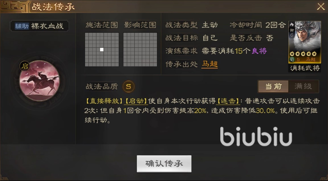 虽然自带战法已经很好,但是并不完美,要想真正成型还需要搭配上另一个关键技能,裸衣血战,由马超分解而获得。效果为使用之后自身获得连击状态,这样才是名副其实单体输出核心,另外一个技能搭配万军取将或暴戾无仁等都可以成型,或者是添加上防御方向、群体输出等,都可以接受,按照自身技能储备情况选择就可以。打造完核心之后,接下来就需要选择阵容中其他队友,同样以魏国为主。