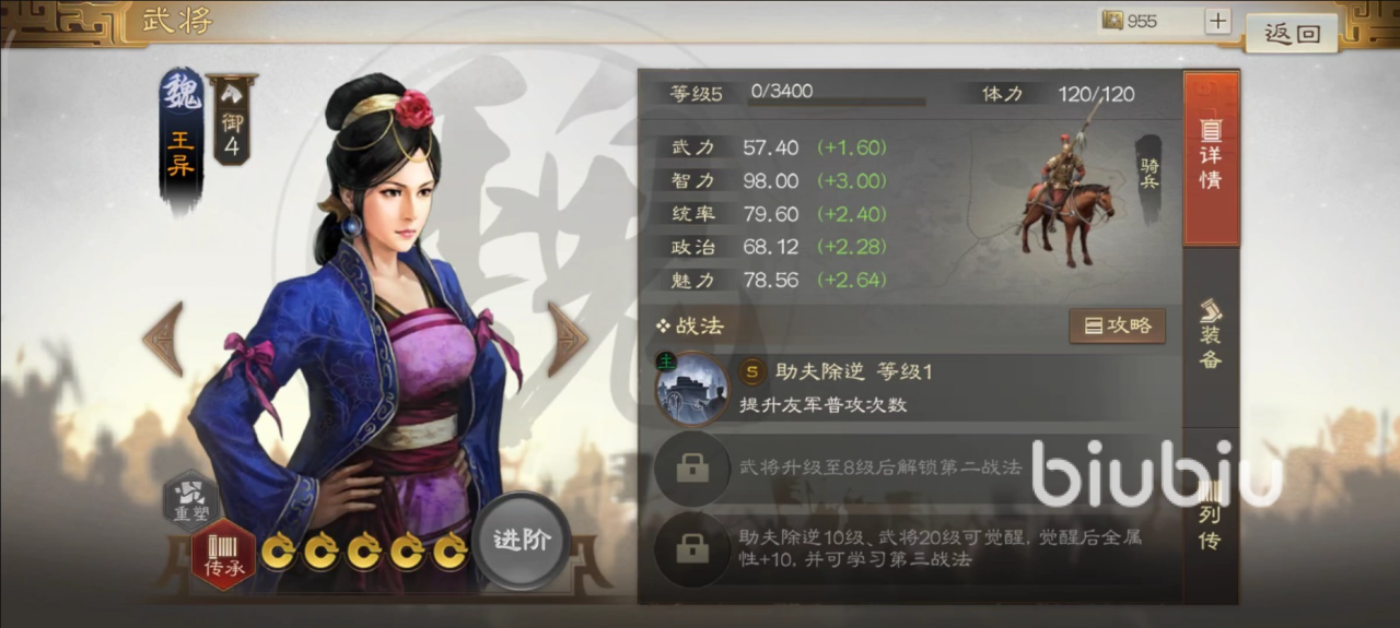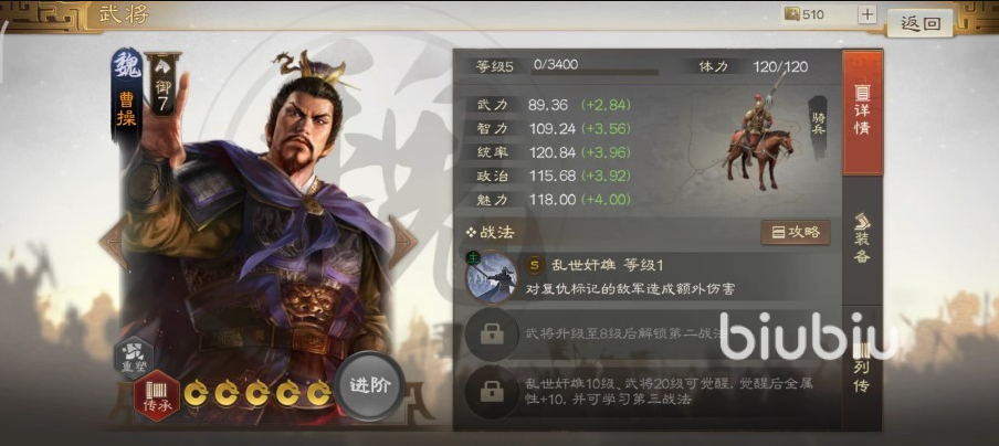 此武将武力值极高,战法可以为自己带来先攻状态,在此状态下攻击不会受到对方反击。造成主动武力损伤之后,会额外追加一次输出,如果当前选定目标处于周围没有队友情况下,则获得额外加成以及击退对方,让其位置改变带来其他效果。再加上自身属于骑兵,移动力超高,完全可以移动到最合适输出位置,将技能效果达到完美。