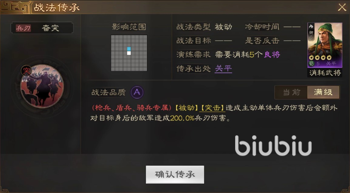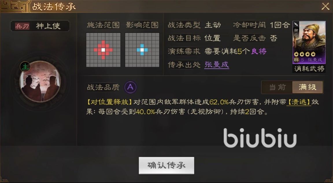 第2个选择奋突,在关平那里获得,属于枪兵、盾兵和骑兵的专属技能。能够在主动造成兵刃伤害之后额外触发一次输出,对目标身后单位造成损伤。比较考验释放技巧,一定要选对施法对象才能将此技能伤害发挥出来,但打满输出之后最终量极其可观。第3个是神上使,由张曼城传承之后获得,释放之后可以对选中范围内敌方所有目标造成一次群体输出,并且附加溃逃效果。被溃疡所影响目标接下来持续回合内会不断损失兵力,并且无视任何防御,可以理解为真实持续伤害。