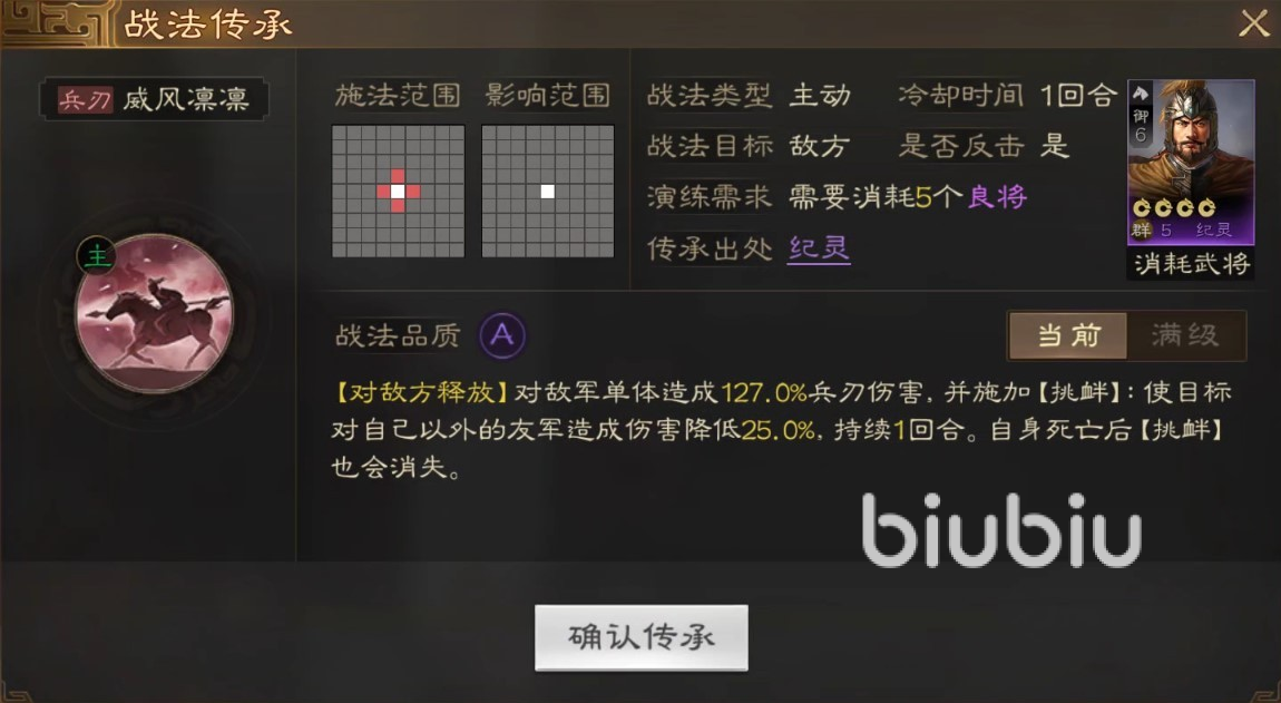 A级技能优势在于只需要5个良将就能成功传承获得,这在前期就能快速形成战斗力,而且获取也只需要分解紫色角色,难度上进一步降低。小编推荐的第1个是威风凛凛,由纪灵传承获得,使用之后可以选择敌方单体目标,造成一次高额兵刃伤害,同时附加挑衅效果。被挑衅目标如果伤害其他单位,则输出降低,起到保护队友作用。此战法伤害高又能对团队起到保护作用,非常适合前排肉盾选择。