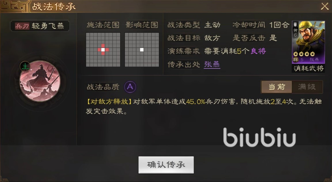 第4个是轻勇飞燕,在张燕处获得,同样是攻击敌方单体,但是会随机触发释放次数。最多释放四次,最少释放两次,比较看运气的技能,但是只要脸足够好也能爆发出很高伤害输出。很多武力值比较高的武将甚至是橙色核心,都纷纷选择这一技能强化自身输出,人气非常高。