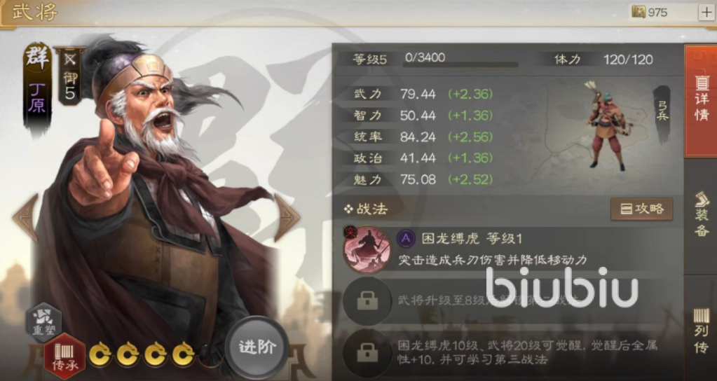 丁原在游戏内属于群雄势力,不过由于实力的原因,他在系统内是一个四星级的武将,实力肯定比不上那些五星武将。不过各方面属性值的话其实是比较均衡的,武力和统率能力比较高,智力和政治能力稍稍差一些。因此,我们也是可以判定他是一个偏战斗型的武将,在对战的时候可以使用战法进行突击,造成主动单体兵刃伤害后,还能对目标额外的造成一次兵刃伤害,并且使目标的移动能力降低一点。