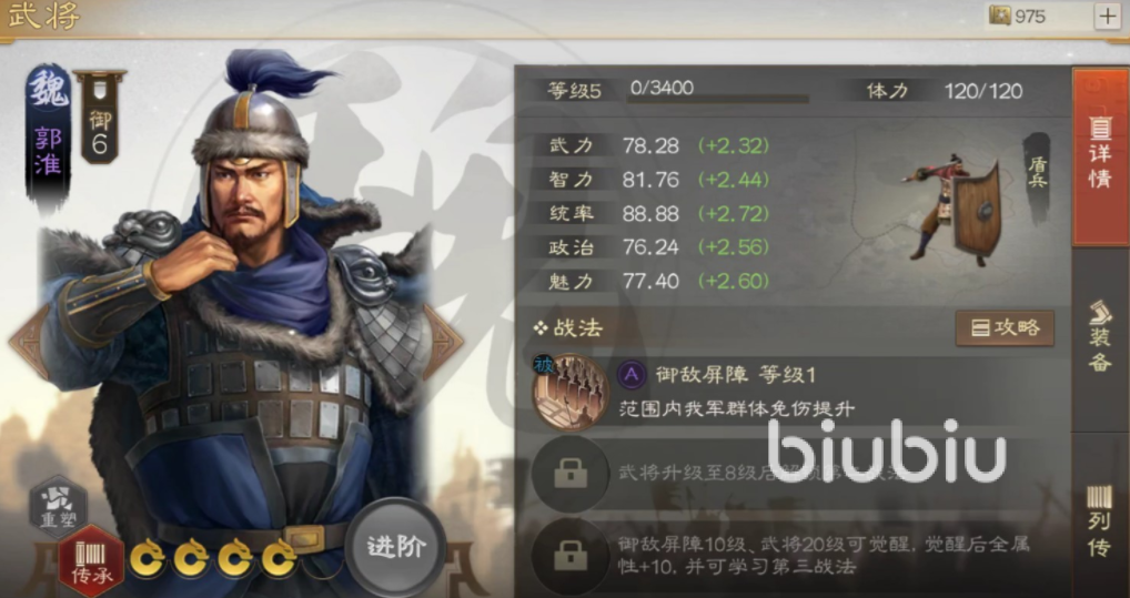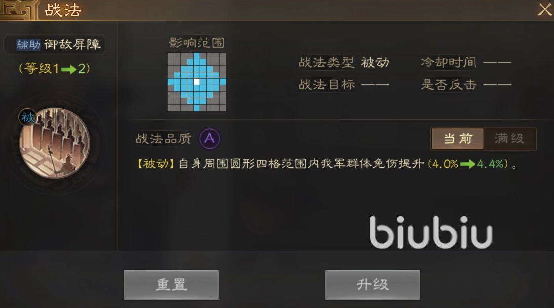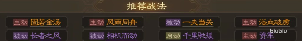 这个武将在四星武将中实力比较靠前,武力、智力、统率、政治以及魅力都在八十点左右,发展比较均衡,在游戏内还是很值得养成的,这个武将的战法释放方式是被动的,不需要玩家们手动操作,影响范围非常广泛,以自身周围圆形四格范围内的所有队友都会收到庇护,可以提升群体免伤效果,这在对战的时候还是很有用的。