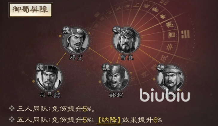 郭淮拥有同队加成的效果,在与司马懿、邓艾、郝昭、曹真这四名武将任意两名同队,可以提升5%的免伤效果,如果五人一起同队的话,在提升免伤效果的同时还能增加6%的纳降,因此,玩家们在组队的时候,尽可能选择这几个武将在一起,能让郭淮的实力发挥到极致,目前游戏内这个武将的特性也是很全面的,防卫状态:当自身处于援护时,免伤效果还将提升6%。