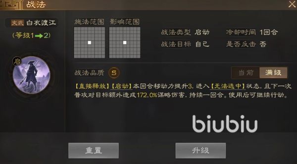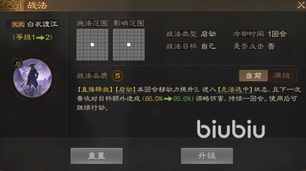 关于他的战法搭配的话,大家建议去选择白衣渡江,它是一个s品质的技能,但该技能为一级的时候,大家只要在游戏中使用这个技能,可以让角色的移动速度提高三点,并且该角色还会处于无法选中的状态,也就是敌人无法攻击到角色。