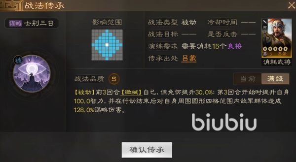 另外还可以再搭配一个士别三日,它可以让角色在前三个回合的免伤直接提升30%,第三个回合开始,智力还会在增加100,而且角色行动结束则还能对周边的敌人造成128%的伤害。