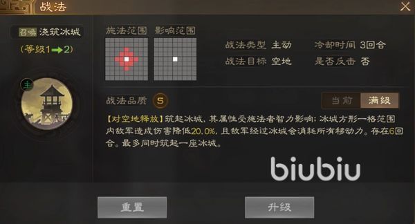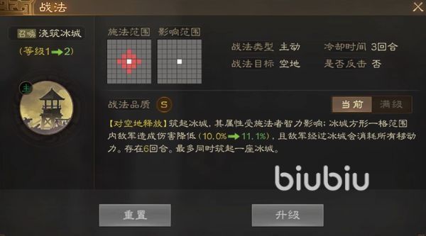 他的战法的话,建议大家去选择浇筑冰城,这个技能效果主要是在敌军的行走道路上做出一道冰城,影响敌军的正常行动,当这个战法能升到满级的时候,可以对冰城一格里面的敌人直接将其伤害降低20%,若是还有敌军路过此地的话,会直接把他们的移动速度全部消耗掉,而且该效果将持续存在六个回合。