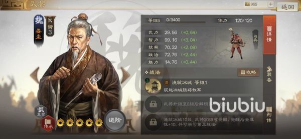 在角色的属性数据中,大家能看出来他非常的不善于武力战斗,他的武力值只有29,但是这不代表他的强度并不是很高,他是作为一个五星级的角色,他的智力高达99,就相当于现代的文官,他的谋略伤害会对敌人造成高额的伤害。
