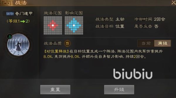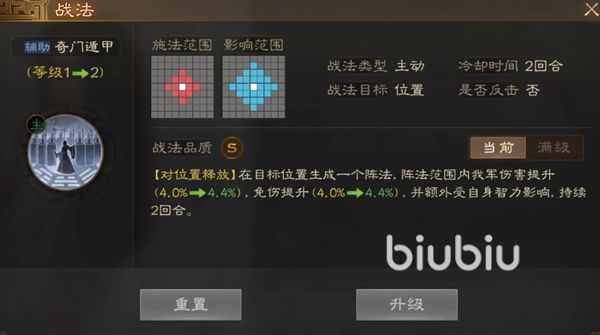 关于这个角色的战法选择,大家可以去选择奇门遁甲,当这个战法处于一级状态的时候,可以直接对角色群众的地方进行制作一个法阵,可以让处在该法阵里面己方的武将伤害提升4%,而免伤能力也会提升4%,并且受到角色智力影响,维持两个回合。