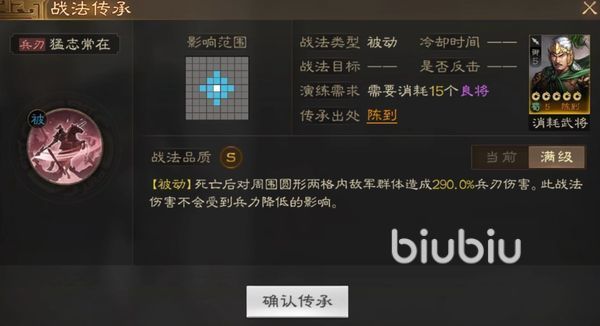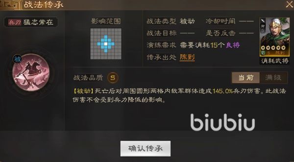 第二个名为猛志常在,当角色自己死了之后,会直接对周边两格以内的所有敌军造成145%的兵刃伤害,而且不管此时角色他自己的兵力如何,这个伤害是固定会打出来的,不会受到角色的兵力影响。