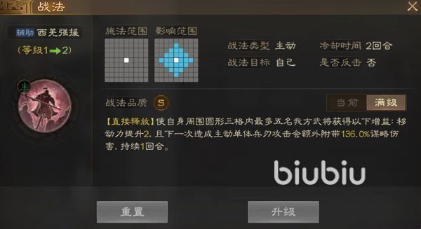 关于这个角色的战法选择,推荐大家可以带上两个,第一个叫做西羌强援,他在游戏中的主要作用是可以给自家队友提供移动力的提升以及攻击还会带来额外伤害效果,那大家把这个技能升到满级之后,他能让角色自己身边的最多五名队友都能将其移动力提升两点,而且对敌人的下一次兵刃伤害则还能再附带136%的谋略性伤害,这个效果还能持续一个回合。