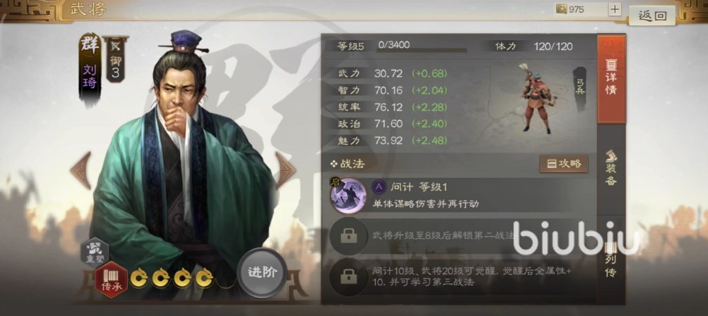 刘琦在游戏里是紫色武将,5维属性除了武力其他都还不错,自带战法可以对单体造成谋略伤害,并且释放技能之后继续行动。“再动”这种技能在战棋游戏里还是蛮常见的,在游戏前期挺适合发挥的,可以在输出之后快速移动到更为安全的方格内,例如援护武将的附近,或者一些地形。