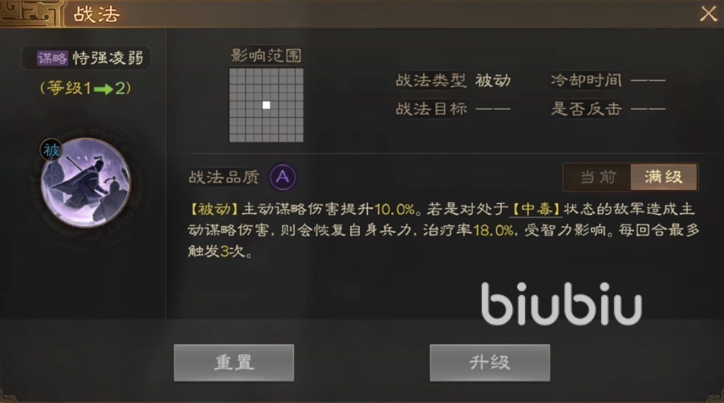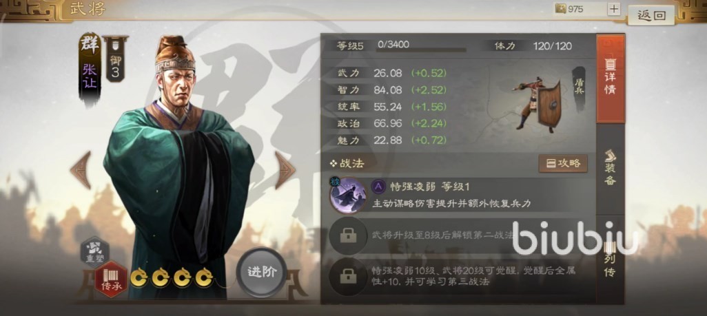 张让虽然武力值低,但为人非常聪明,游戏中智力属性也很高,统率值一般,因此在兵力数量上自然是有所欠缺的。但作为前排盾兵他可以凭借着高智力以及战法造成可观的谋略伤害。如果敌方有处于中毒状态的敌人,还可以对恢复自身兵力。特性被动降低周围敌人智力与统率值,但容易受到更多的兵刃伤害。
