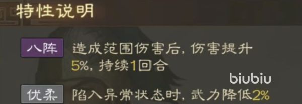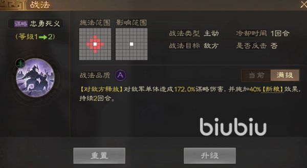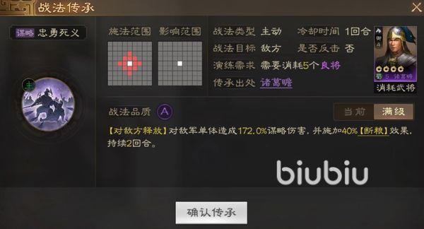 在游戏中他的战法名为忠勇死义,是一个A级的技能,当他打到满级状态的时候,角色可以使用这个主动技能,对对面的敌人单体直接造成172%的谋略伤害。