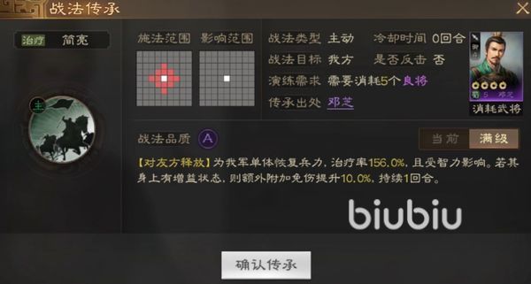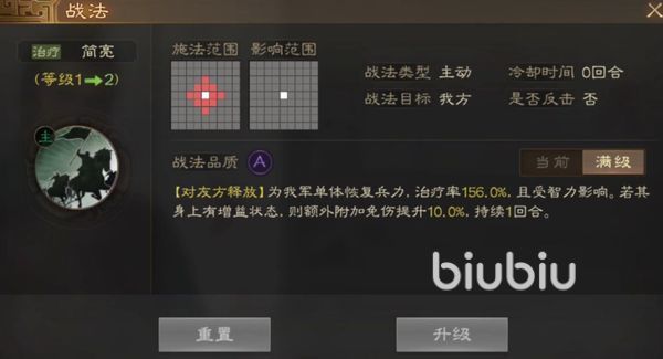 他的战法名为简亮,是一个A级品质的技能,还是一个主动技能,可以在我方队友受到大量伤害,血条状态并不是很好的情况下,点击使用能够快速恢复队友的兵力,治疗量最高还能达到156%。