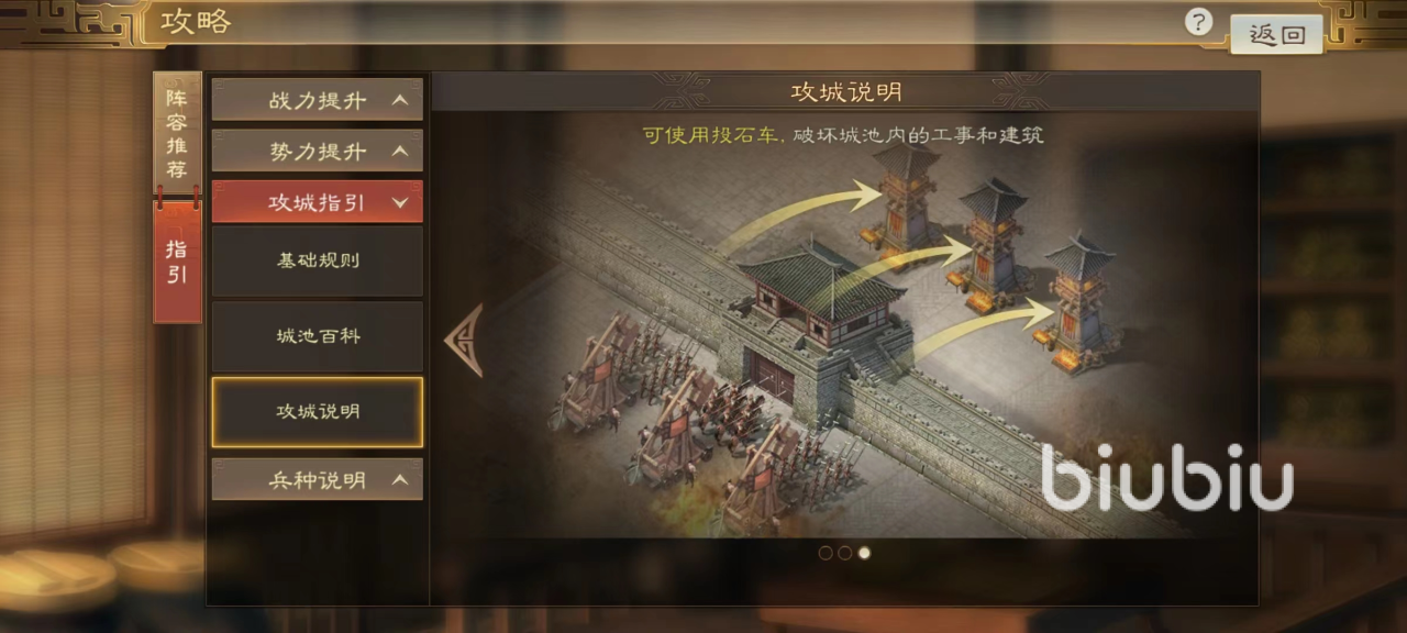 此外每个城市中还都有驻军所,用于囤积士兵,而对于进攻者来说,最大优势就是依靠攻城器械,也就是军械方所制造出来的投石车。这一项工具能够对建筑物造成极大杀伤,快速拆毁对方城墙和其他防御建筑,让部队攻进城池开始占领。而升级建筑所获取加成是可以提高储备上限,再就是缩短建造时间,因为攻城车也是会损坏的道具,必须及时补充。