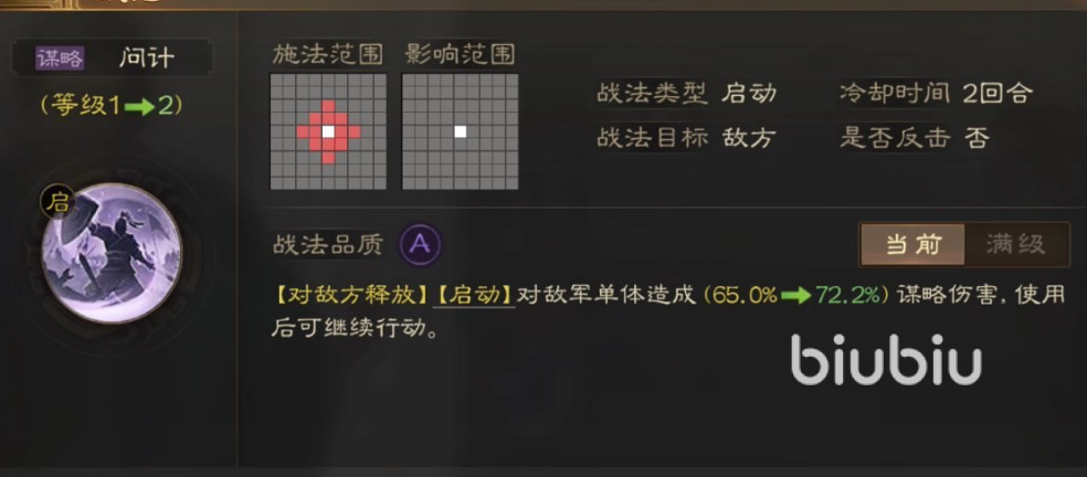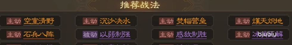 他的兵种配置也是游戏力度输出兵种,弓兵,所以在战斗中他担任的是后排主力输出的位置,而他战法也确实可以让他担任输出的位置,他的两个战法都是主动伤害类型的单体战法,伤害效果还不低,可以打出不俗的伤害。