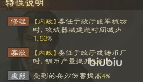 那么为什么还说他是一个比较杂乱的武将呢?那是因为他的特性,他的一共三个特性,两个内政特性和一个dbuff特性,这就代表他在战场上是一个没有任何特性buff的武将,并且还会受到自身dbuff的影响,这个dbuff的效果会使他在战斗中受到的伤害加深。