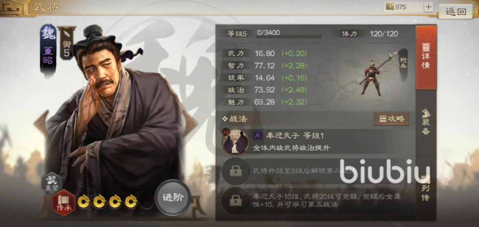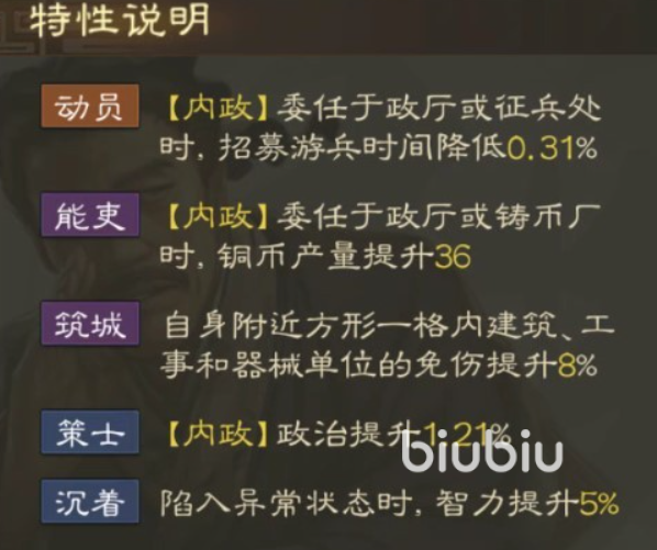 放到建筑工事里也能为建筑提高免伤能力,董昭虽然属性不高但是却实打实的在游戏当中各项建筑都能有效的帮助到玩家。处在内政朝堂还有提高政治的作用,如果状态异常智力还会出现不断的提升。