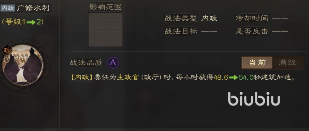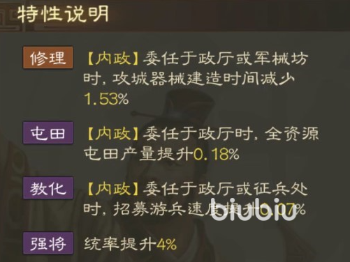 那么除掉这两个方面之后要看的只有战法和特性了,首先是战法,战法一般来说是决定内政武将强弱的最基本要素,他的两个战法都是建造加速,是按小时加速的,加一起一共可以加速几分钟的时间,这几分钟的加速看人,有的人觉的重要有的人觉得不重要。