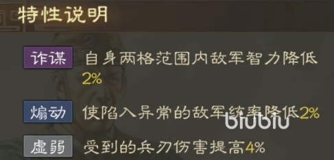 之后是特性,特性方面,他拥有两个增益特性和一个dbuff特性,增益特性的效果是降低敌方的属性,dbuff特性的效果则是被攻击时受到的伤害提升,这个dbuff特性是非常难搞的,因为他的兵种是配置是盾兵,盾兵是前排定位,他本来属性就不高,在有个dbuff增伤特性他在战斗中很容易暴毙。