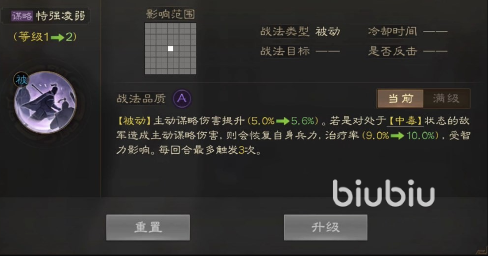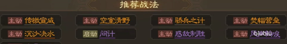 这第二个要看的属性就是战法配置,他的战法配置为两个被动战法,其效果可以提示谋略伤害,并且会对处于中毒状态中的敌人造成谋略伤害,之后会恢复友方的兵力,一个回合中最多可以触发三次,记住了这是被动触发没有任务条件,这个效果就很bug了,配合上一些可以上毒buff的武将,他的战法是非常强力的。