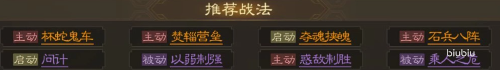 徐庶的战法推荐很少有被动技能,主动技能分别为杯蛇鬼车以及石兵八阵还有焚辎营垒。这三个主动技都是S+级别的战技,在游戏当中战斗的实力可谓是一骑绝尘。