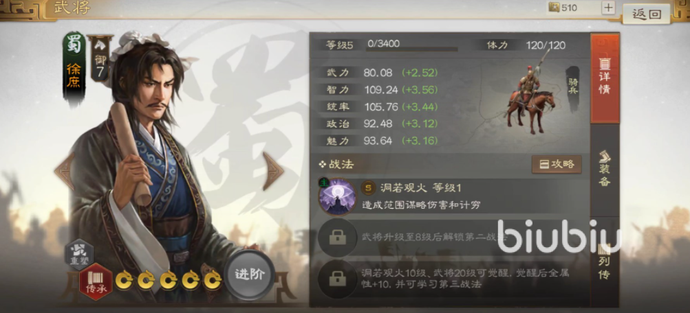 属性值一直都是一个武将最值得受人关注的地方,徐庶的五项属性值都高的惊人,智力和统率能力更是作为爆表的属性存在,稀有度比较低的武将在游戏当中五项属性加在一起可能都没有徐庶的一个属性数值高,从这就能看出来全能将才稀缺少有。
