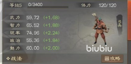 伍孚是一位四星紫色品质的武将,他在属性方面看起来并不优秀,属性成长除了统率之外其他平均在1.8左右,他的部队配置是弓兵,通常来说弓兵是游戏里的输出担当,所以弓兵的将领要求是需要高武力值的,而伍孚显然是不满足这个条件的,那么属性不行就看战法,看看战法能不能救。