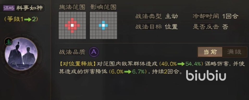 战法方面他的战法配置还是不错的,拥有两个主动释放的群攻伤害类型战法,战法的效果可以对范围内的敌人造成自身百分之49的谋略伤害,并且会降低后续受到的伤害,降低百分之6,这个战法升到满级之后伤害会成长到98受伤会降低百分之12,这个战法效果时间表现中规中矩。