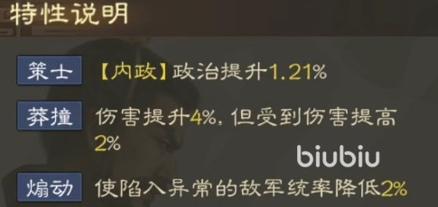 之后是特性,特性方面,他的特性效果也还行,只能说中规中矩,效果为提升政治,提升伤害,给敌人上dbuff,这个提示率的话都不算高,都是一个很居中的提升,对实战的帮助没有那么大。