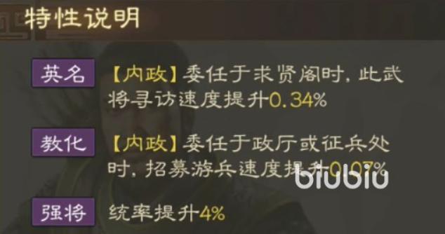 虽然这个角色的战法主要就是为了攻击而存在的,但是吕虔角色的特性却在朝堂之内,如果玩家将吕虔委任到求贤阁当中,寻访人才的速度就会得到显著的提升。委任到招兵处那么招兵处的速度也会得到提升。