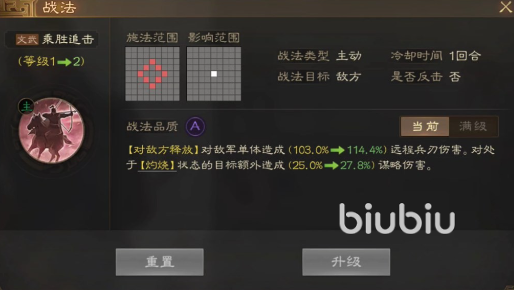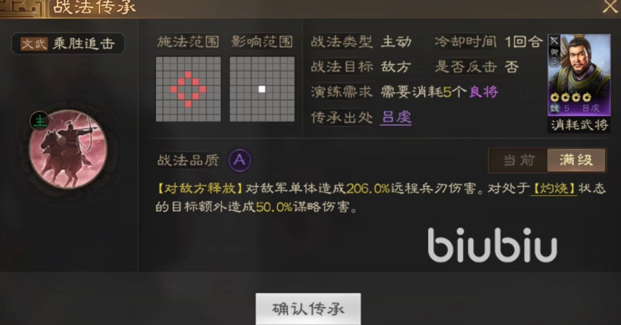 看完属性,接着就来看战法,吕虔的战法也非常契合他弓兵的特性。作为主战技释放后,他可以对目标敌军造成103%的兵刃伤害,除此以外还会给敌方叠加上灼烧的效果,不停的对敌方造成其他伤害。
