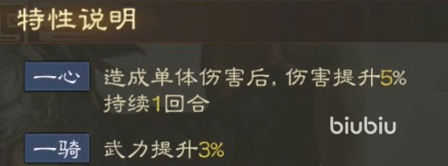 除了战法还要看一下特性,他虽然只有两个特性但是都是增益特性,可以提高武力和伤害,另外他还可以携带其他战法,这些战法只要是防御类型的他都可以带,带上以后配合自身战法的减伤,可以有一个堪比金色品质前排武将的防御效果。
