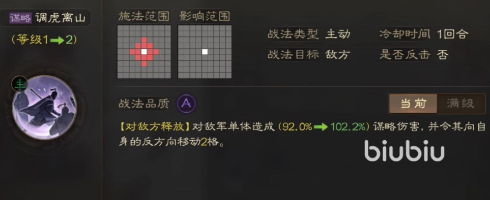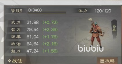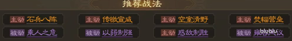 当然看一位武将的强度也不能只看属性,下面来看看他的战法配置,战法方面也是一自带战法加一传承战法,这两个战法都是伤害类型,还都是主动释放,对与一位四星武将来说,其实伤害类型的战法是不多见的,因为属性低的原因游戏里大部分的四星武将都是内政类型,所以这个伤害类型战法真的很稀有,并且这两个战法效果还不错,在伤害的同时还能敌方造成混乱效果,让敌方分不清前后。
