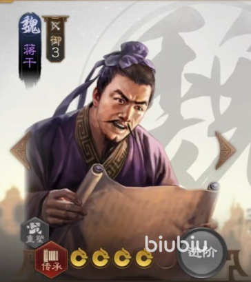 总的来看,蒋干做为一战斗用的紫色品质武将来说中规中矩,强的敌方也有比如战法的混乱效果,弱的敌方也很明显比如特性,具体用不用得看各位对他的喜欢。