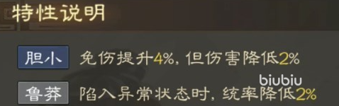 特性方面,他的特性就很难看了,只有两个还都是负面想过,都是降低伤害的类型,这个真的很难绷了,这会导致他原本就不高的伤害变的更低,所以这两个特性是有触发条件的。