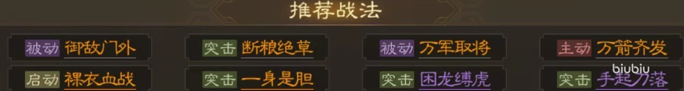 黄忠的战法配置有一身是胆、万军取将、万箭齐发、手起刀落等八个战法,具体如图展示,这些战法都是大部分都是主动释放类型,可以补足黄忠没有主动战法的缺陷,并且还能提高他的伤害。