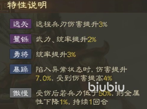 之后是特性方面,黄忠做为正面武将特性也都是战斗类型,基本都是提升武力或者对敌伤害的,最高的伤害提升可以达到百分之7,这还是很高的,从以上的武将分析可以得知黄忠需要搭配的额外战法为战斗类战法,因为双特性是被动的原因,这个战斗类战法选择主动释放类型。
