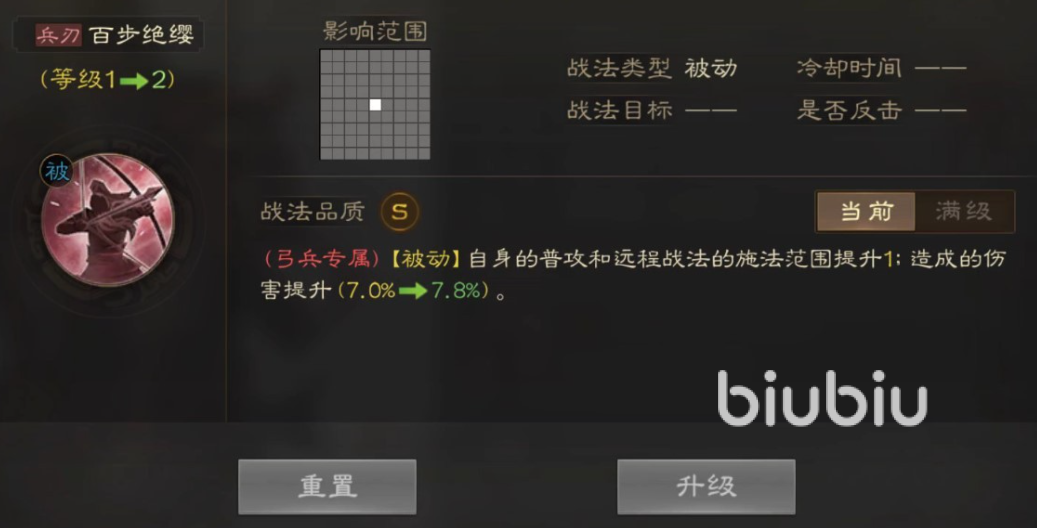当然看分析武将不能只分析面板还要看武将其他的属性,黄忠拥有弓兵部队是一个后排输出的武将,其战法配置也是输出型,他的两个战法都是提高普工和远程伤害的,和敌方距离越远伤害就越高,因为弓手本来就在后方且攻击频率高的原因,黄忠在这点上来看还是可以的。