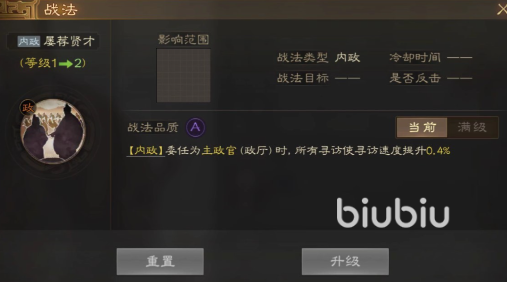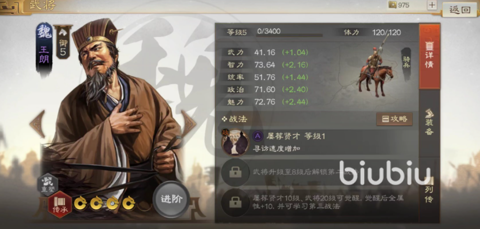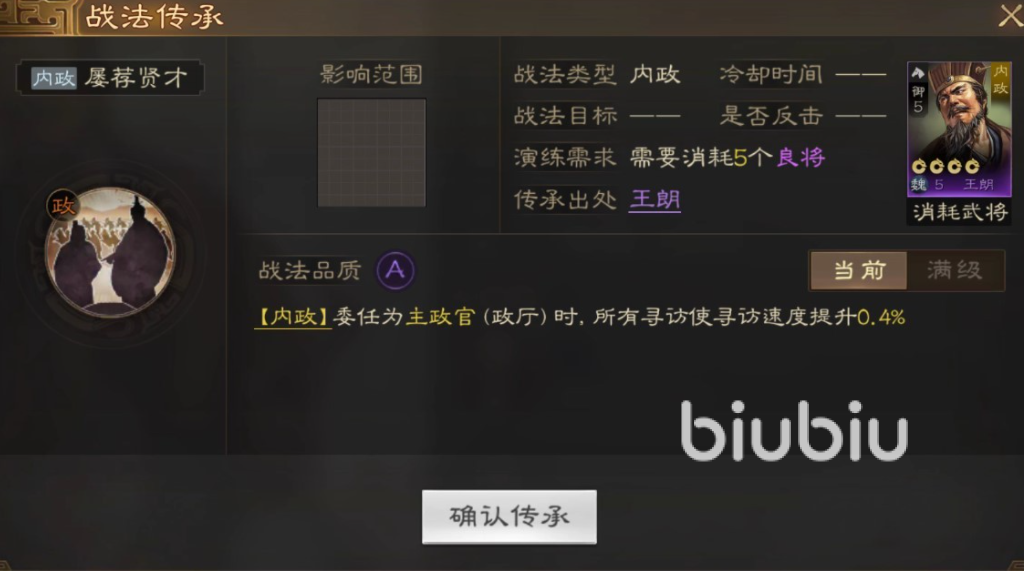这个角色的战法也非常好的佐证了属性这一点,王朗的战法名叫屡荐贤才。作用就是玩家将王朗委任到政厅当中就能够提高寻访人才的速度,因此在没有更好的选择下,将王朗委任到政厅就是非常不错的选择了。