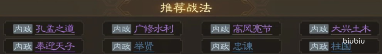 除了以上的这些王朗这个角色战法搭配上更加推荐玩家选择孔孟之道以及广修水利还有高风亮节以及大兴土木。这样的战法能够帮助王朗的实力得到进一步的提升,对于玩家来说也是有利无害的情况。