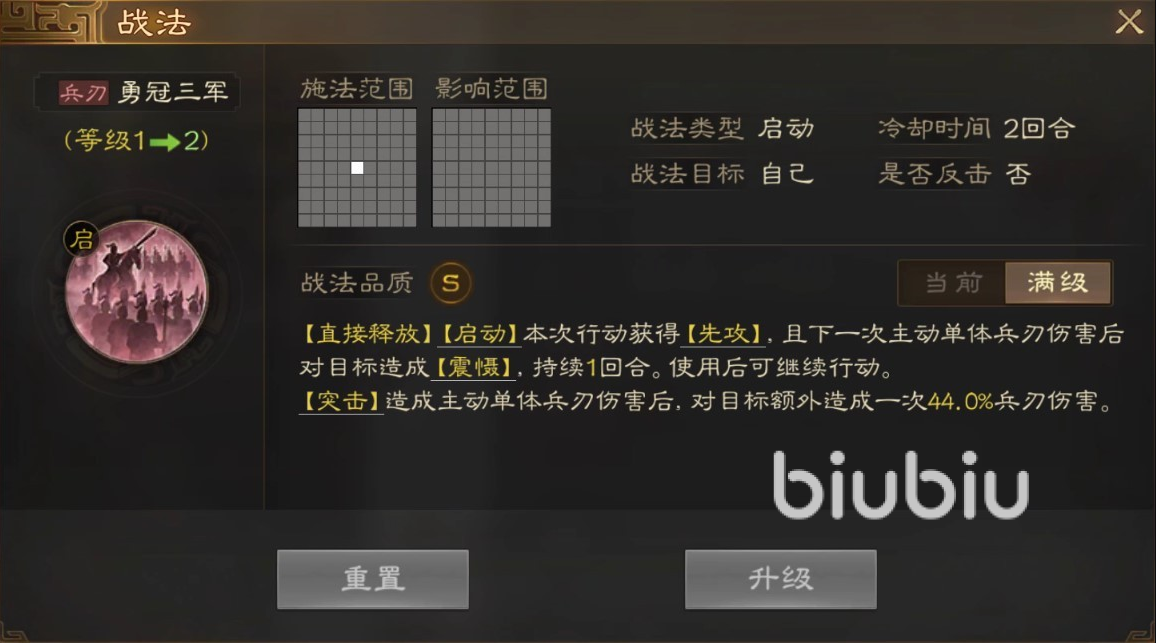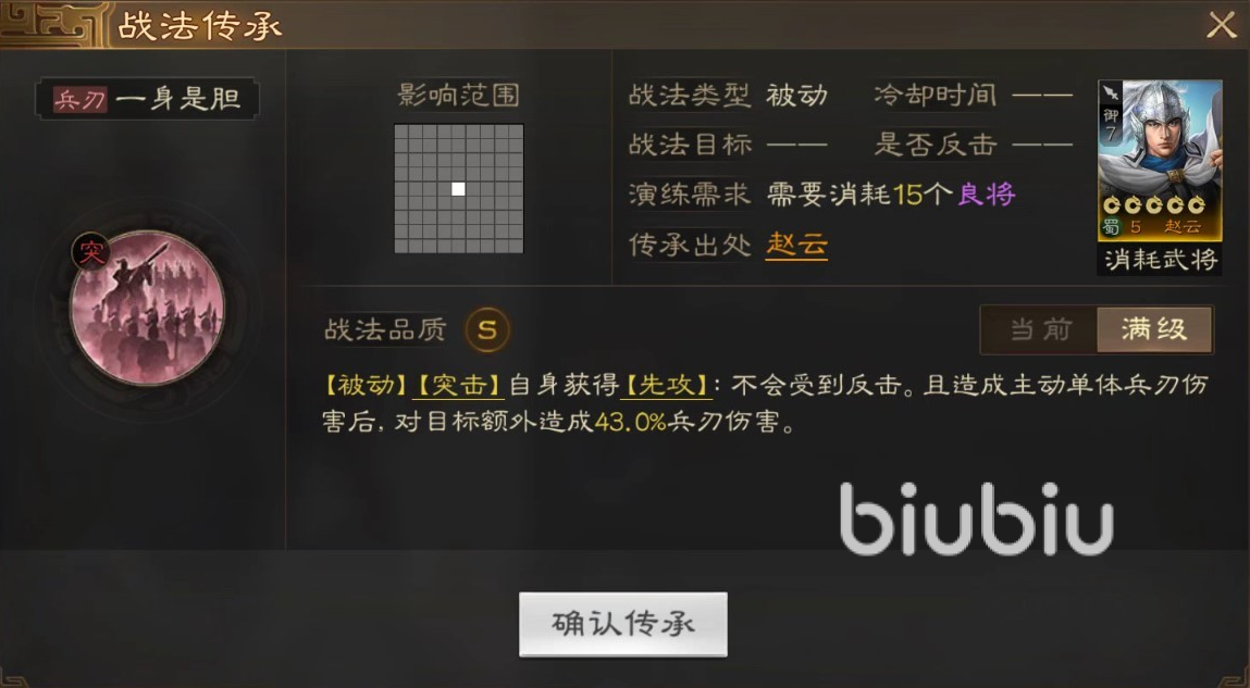 小编选择的两个技能是一骑当千和一身是胆,其中一骑当千由吕布分解后获得,本身就属于突击类战法,能够很好利用颜良自身技能所附带效果。在兵刃伤害之后,再对敌方右边和左边1格范围内其他目标附加伤害。这样就使单体伤害扩充到小范围,群体总量更高也更利于选择释放目标。