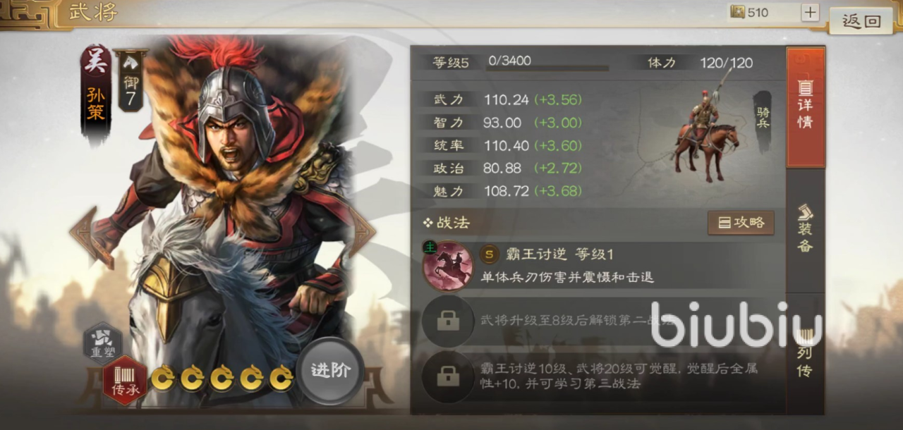 孙策自身属性无论是武力还是统率值都非常可观,完全称得上是超一流武将,这就为后期输出和防御带来属性上的基础。接下来是自身战法效果,自带技能霸王讨逆,选择单体目标为输出对象,在造成兵刃伤害后可以对其进行震慑,并且击退两格。如果在击退过程中触碰到其他目标,则对被撞击目标也会造成额外伤害,所以在释放时候比较讲究角度和目标,选择稍微考验一下操作。附带震慑是很好的控制状态,这样孙策就既有输出又有控制,非常全面。